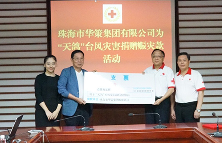 身為民營企業不忘社會責任,8月24日,心系災情的珠海市華策集團有限公司第一時間通過珠海市紅十字會,為“天鴿”強臺風災害捐款1000萬元,用于災后市政道路的清理和恢復。副市長、市紅十字會會長閻武代表市紅十字會接受了捐贈并表示,不辜負捐贈企業的期望,公開透明用好這筆善款,并及時對賬目進行反饋。