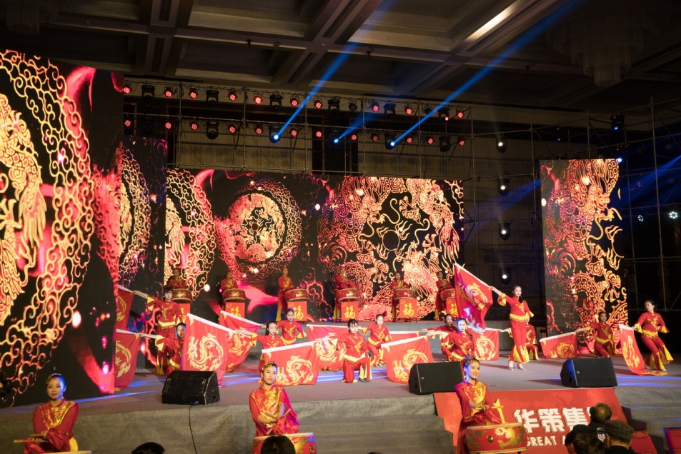 華策集團2018年迎春晚會在云浮公司帶來的開場舞《鼓舞飛揚》中正式啟幕。鼓樂齊鳴、旗幟飄揚,激情澎湃的舞姿將現場氣氛點燃。