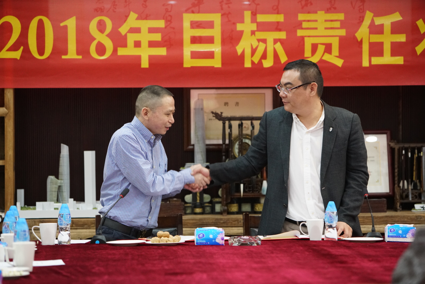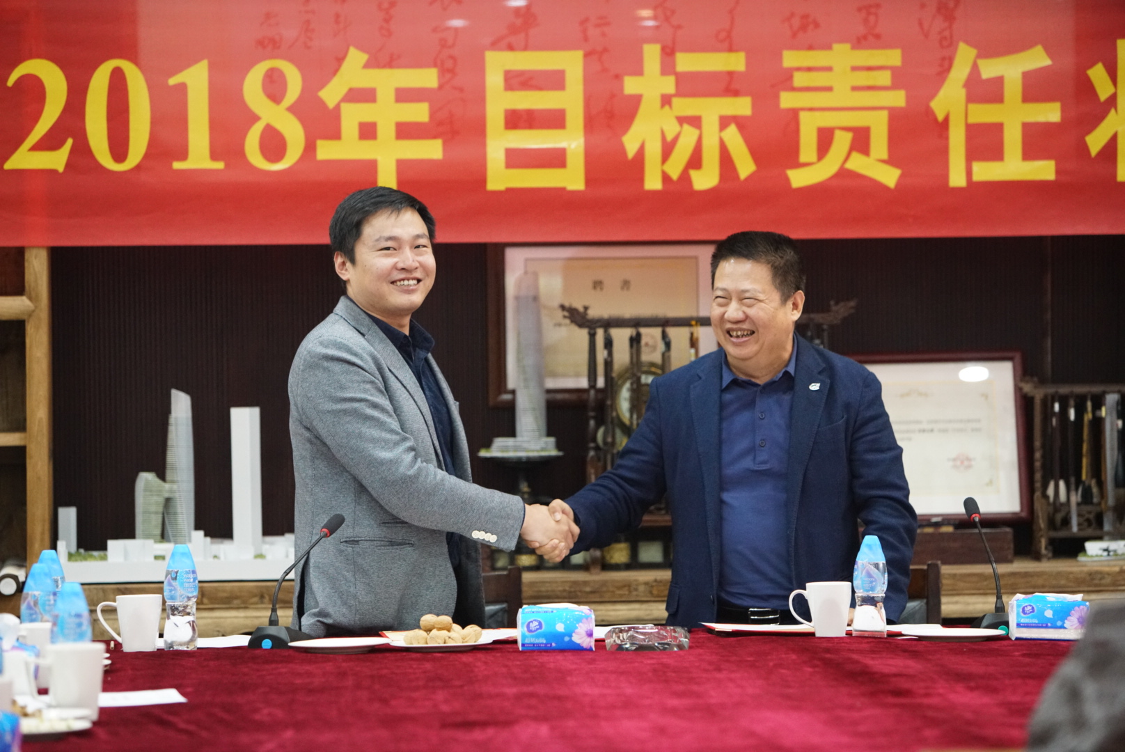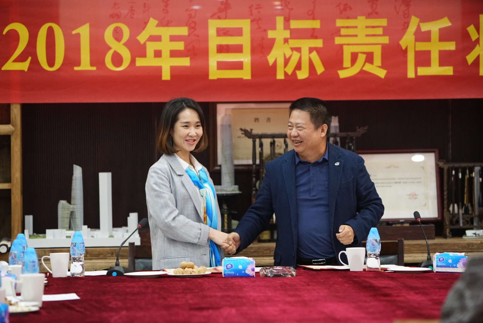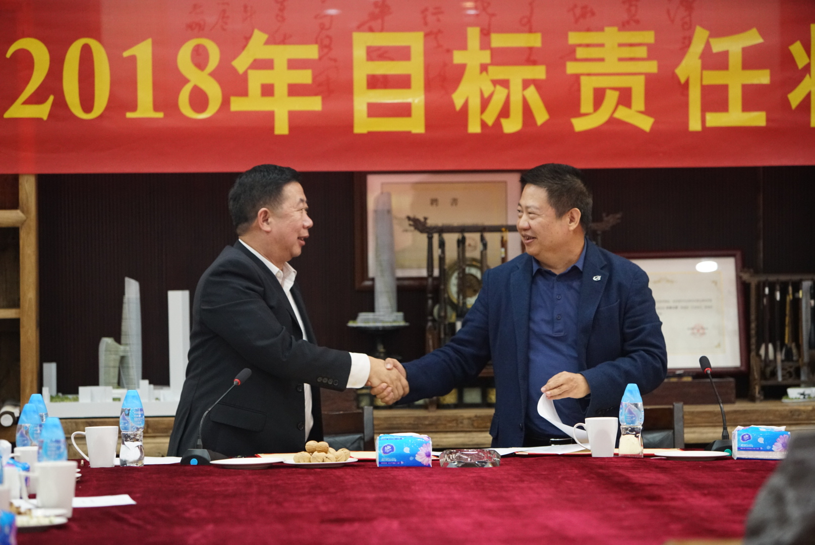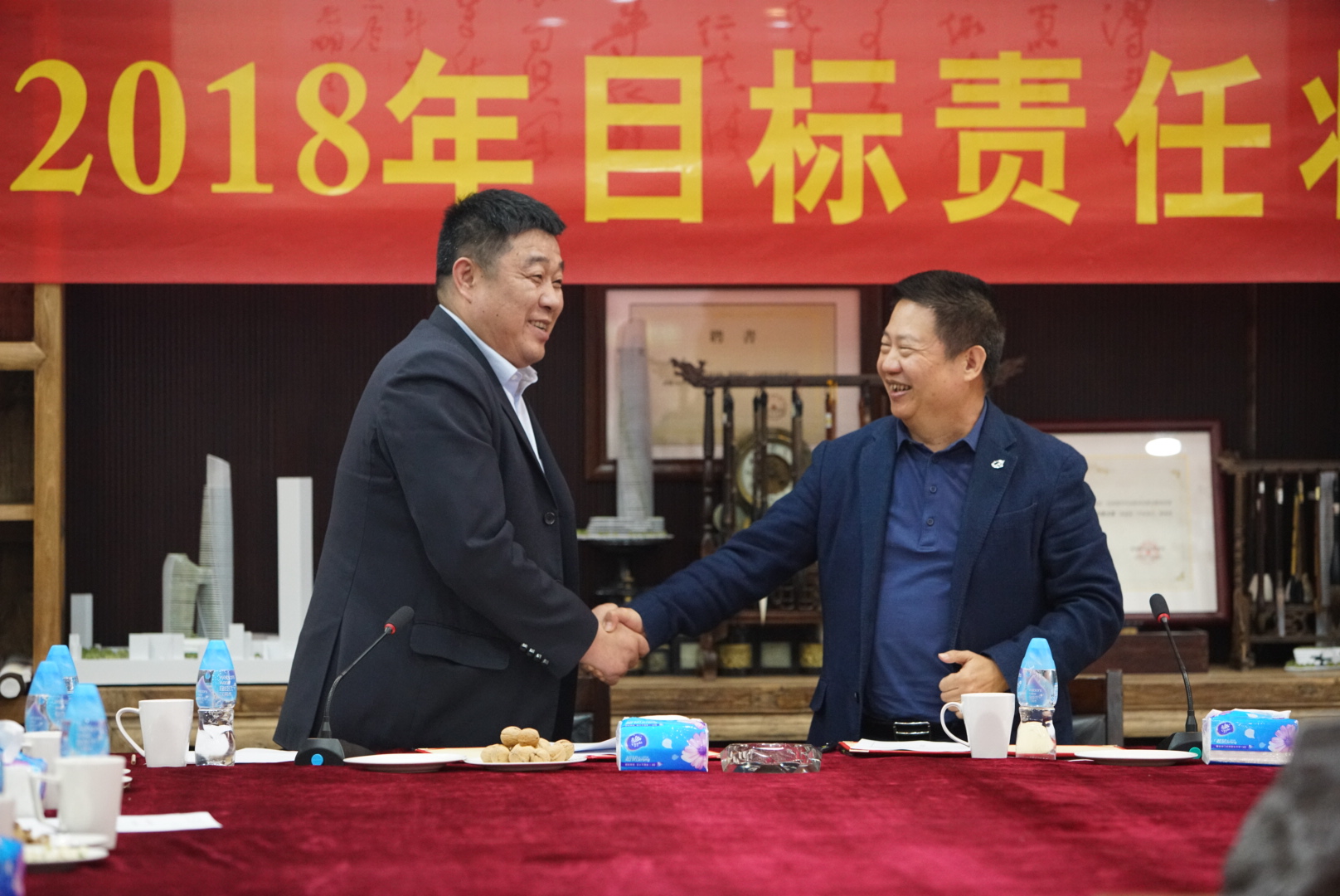 房地產(chǎn)事業(yè)部項(xiàng)目管理中心主任張勁松與董事常務(wù)副總裁梅合理簽署目標(biāo)責(zé)任狀