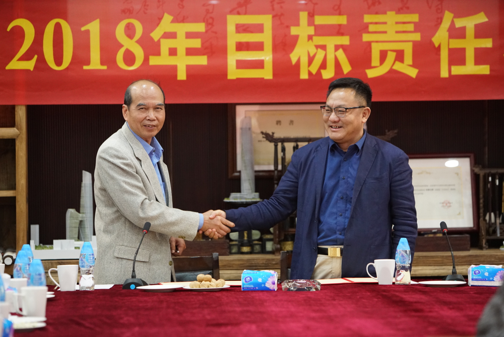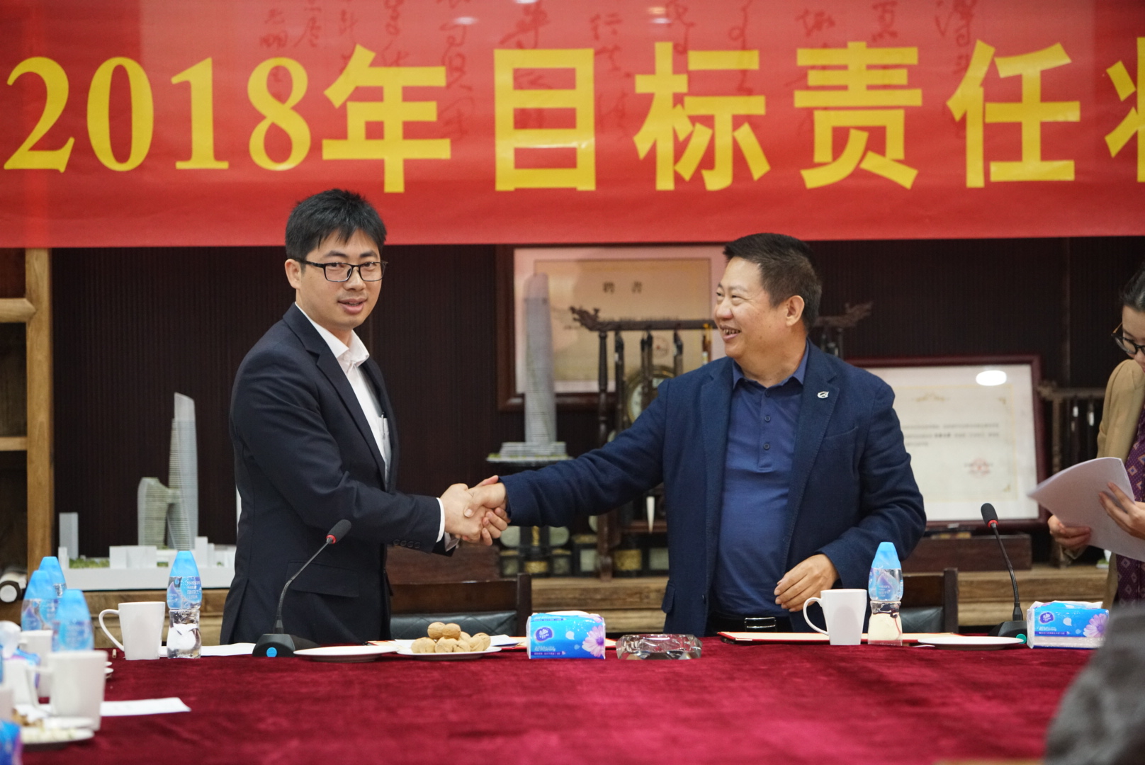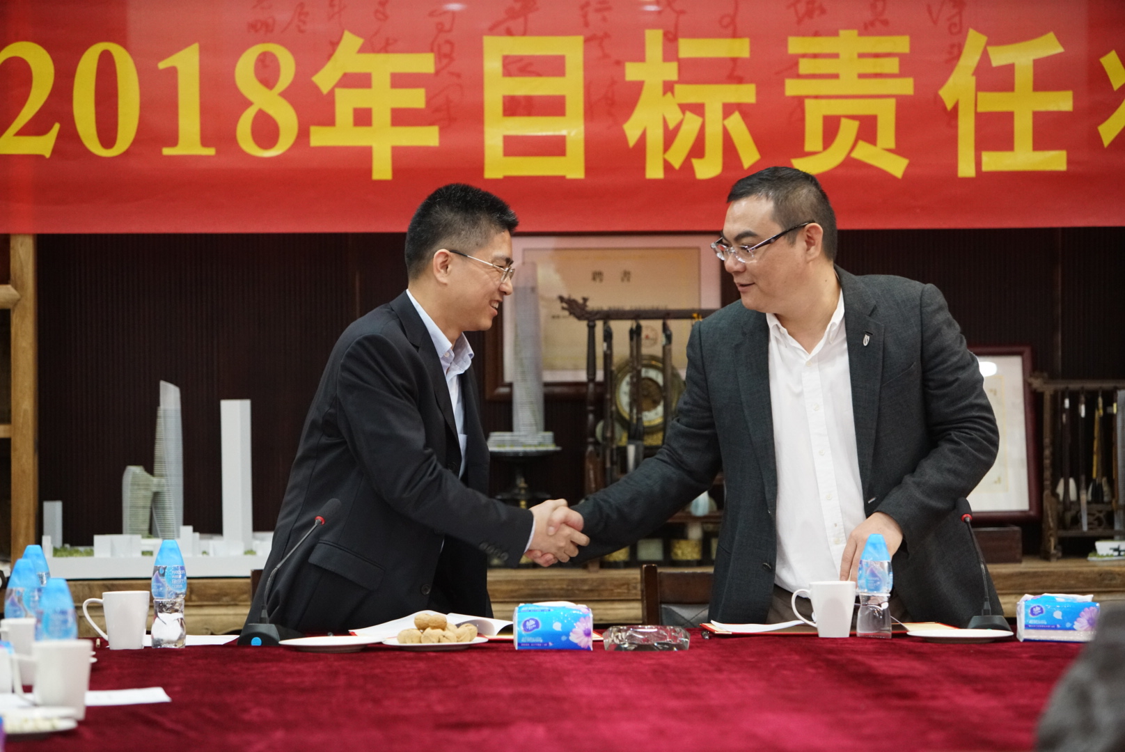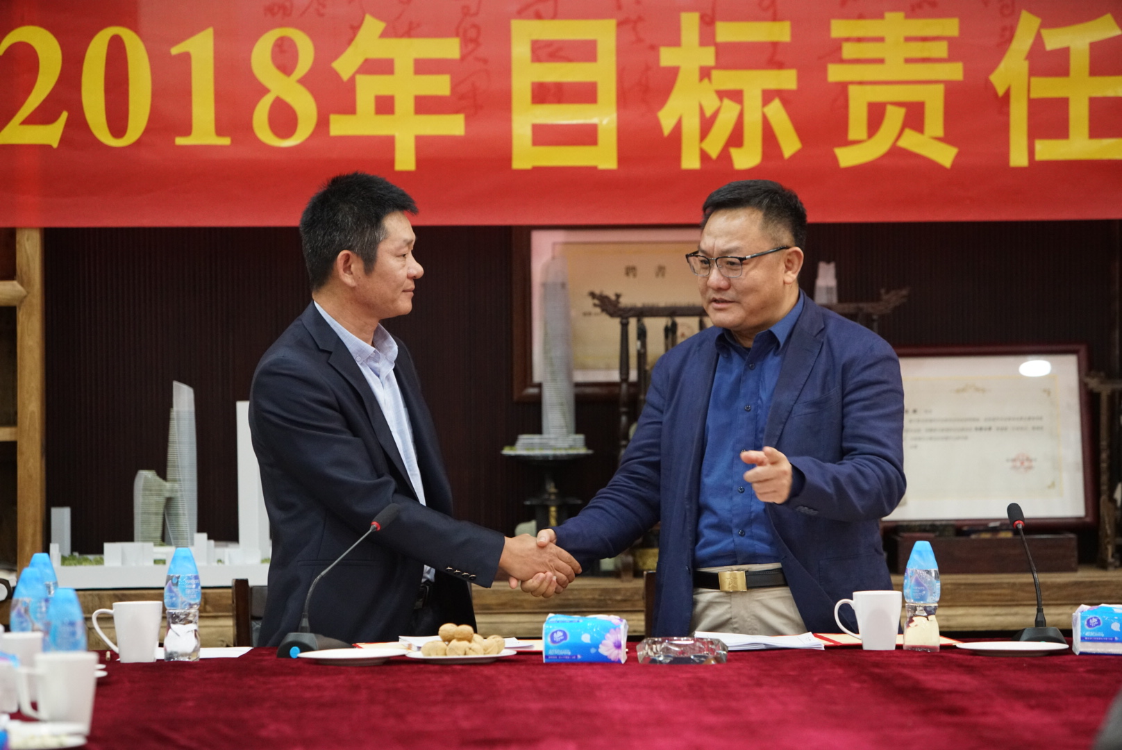 房地產(chǎn)事業(yè)部項(xiàng)目管理中心主任張勁松與董事常務(wù)副總裁梅合理簽署目標(biāo)責(zé)任狀