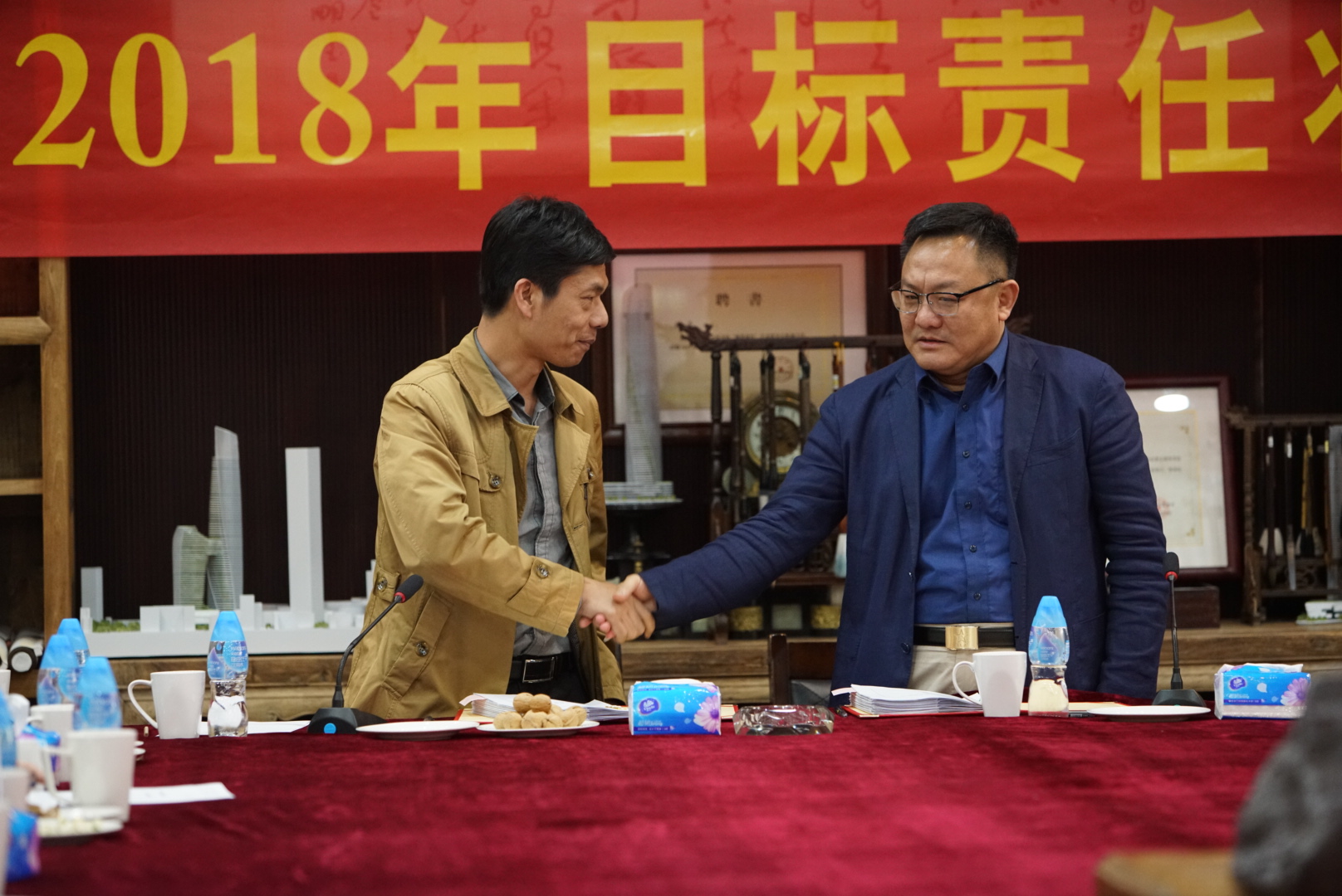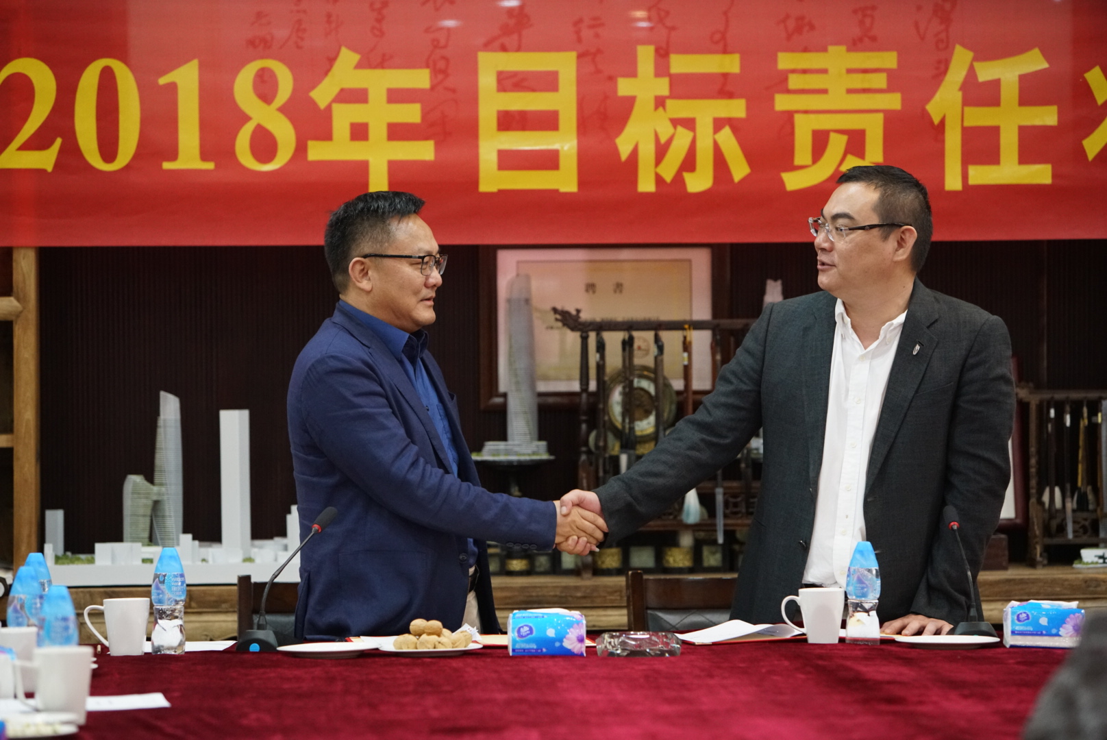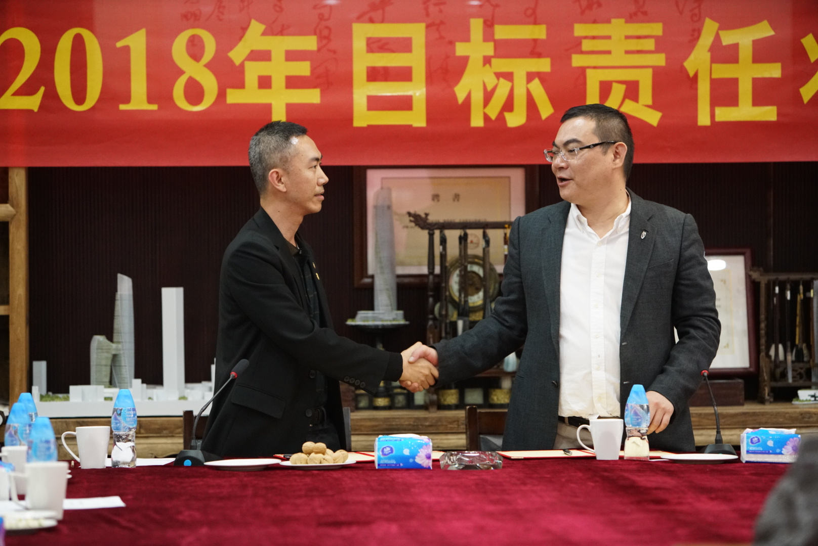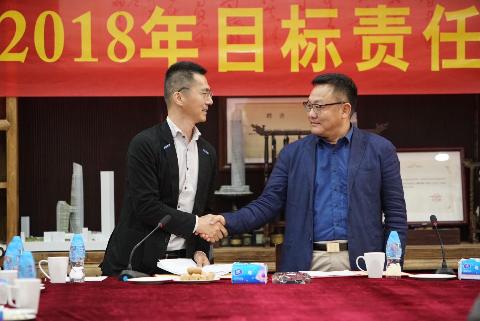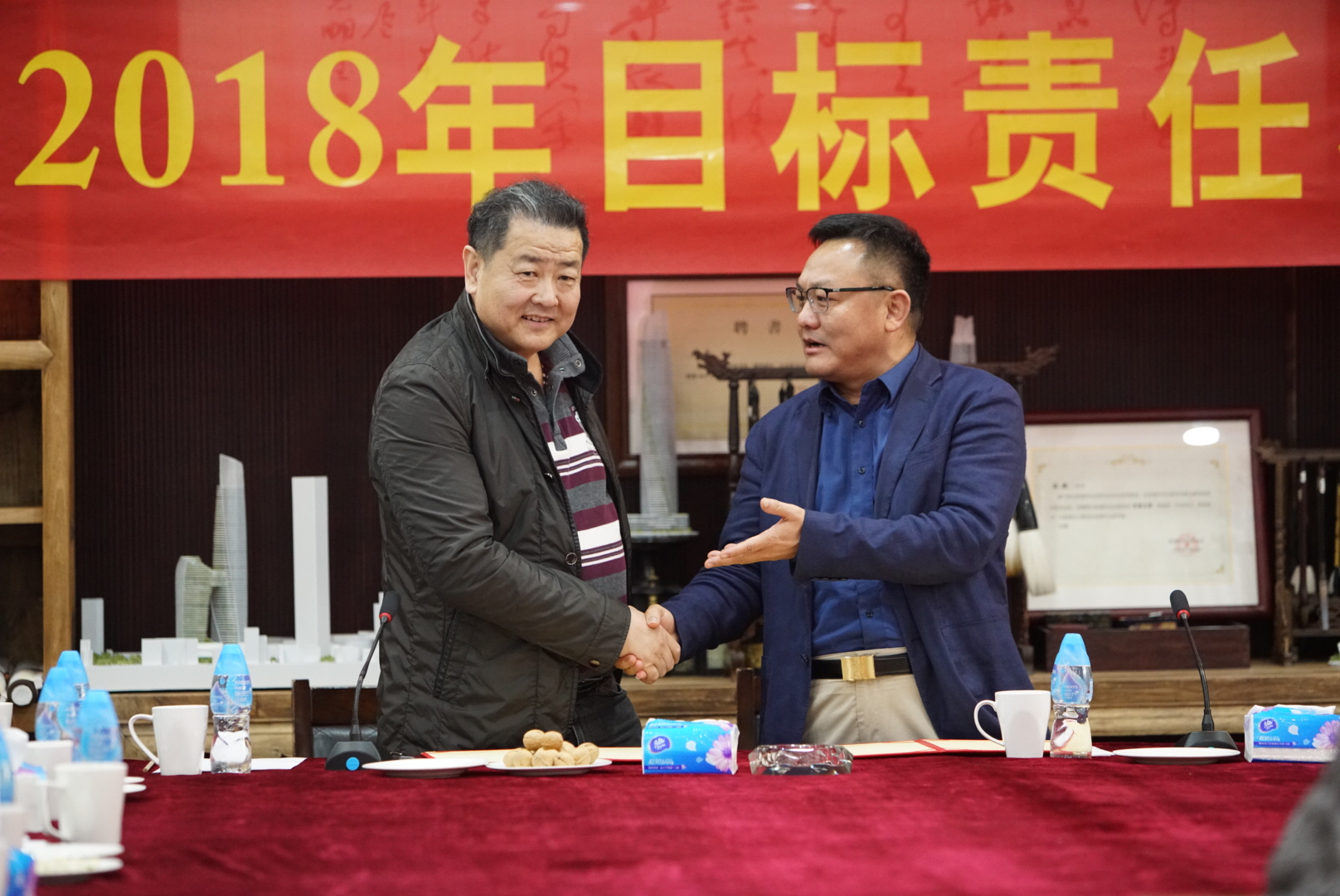房地產(chǎn)事業(yè)部項(xiàng)目管理中心主任張勁松與董事常務(wù)副總裁梅合理簽署目標(biāo)責(zé)任狀