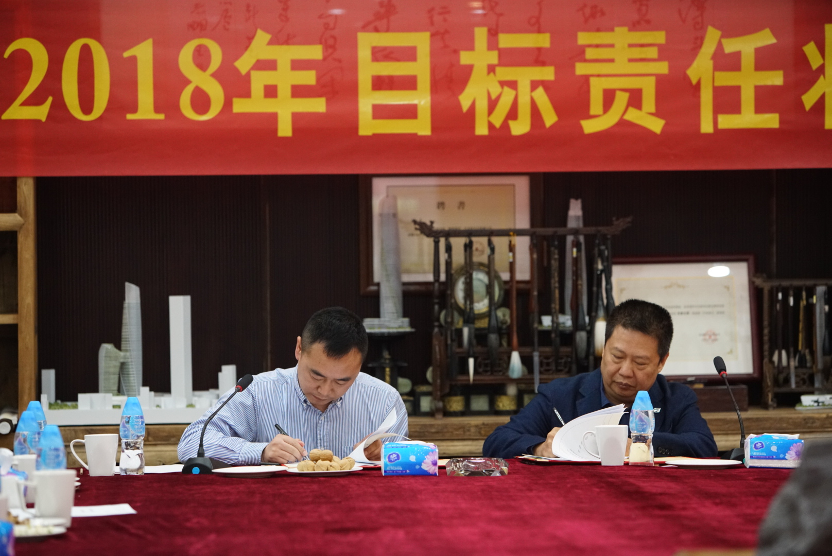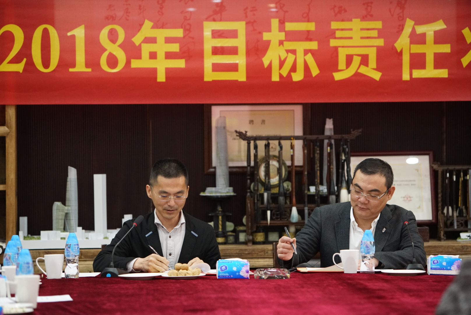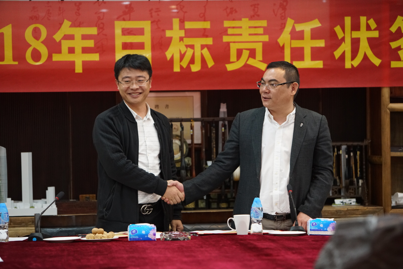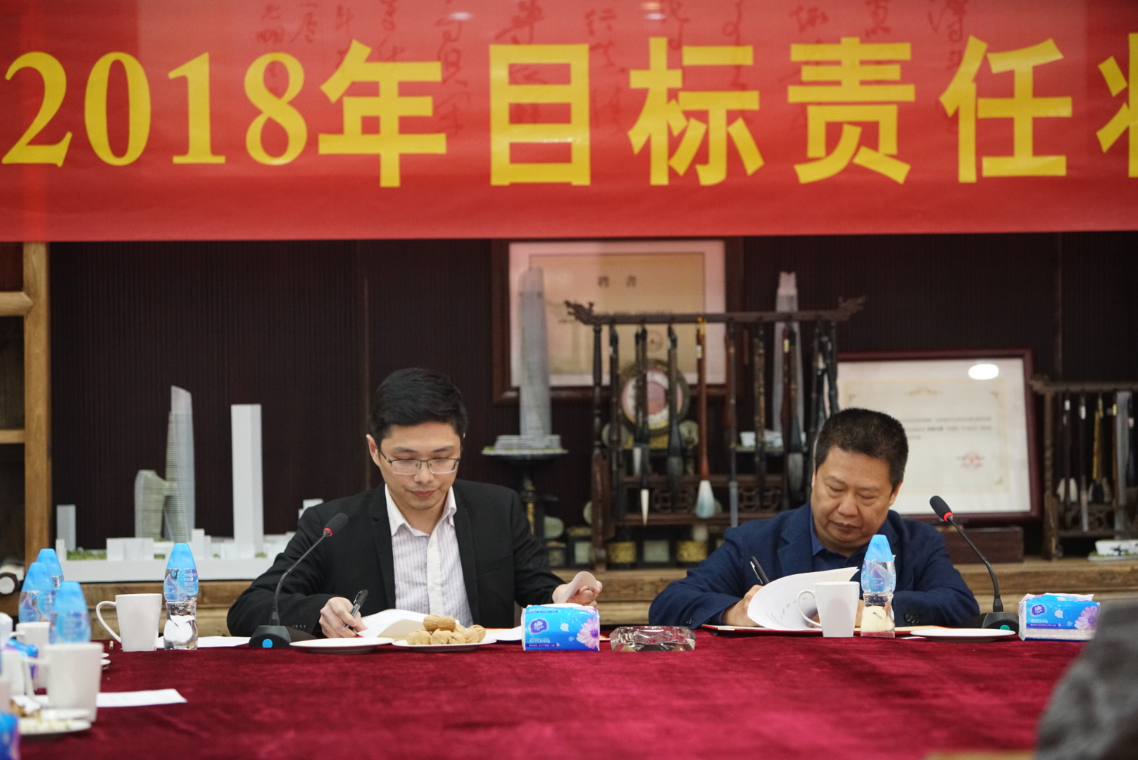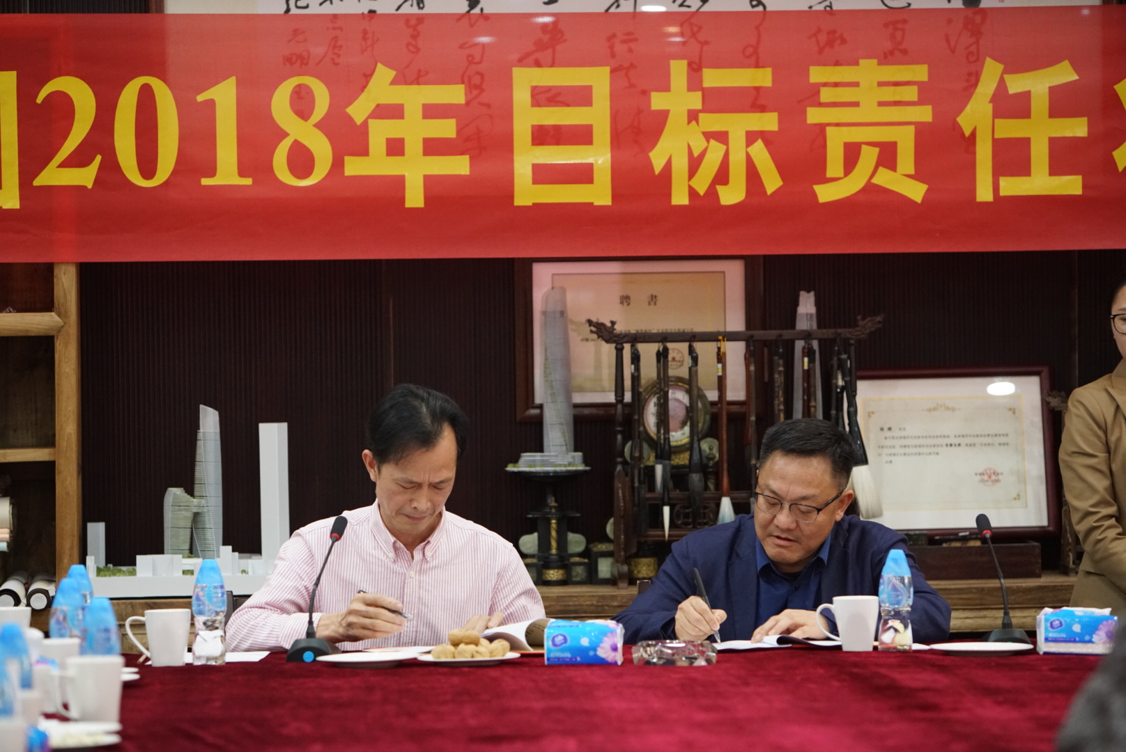 營(yíng)銷策劃中心策劃總監(jiān)王曉飛與董事局常務(wù)副主席楊智雄簽署目標(biāo)責(zé)任狀
