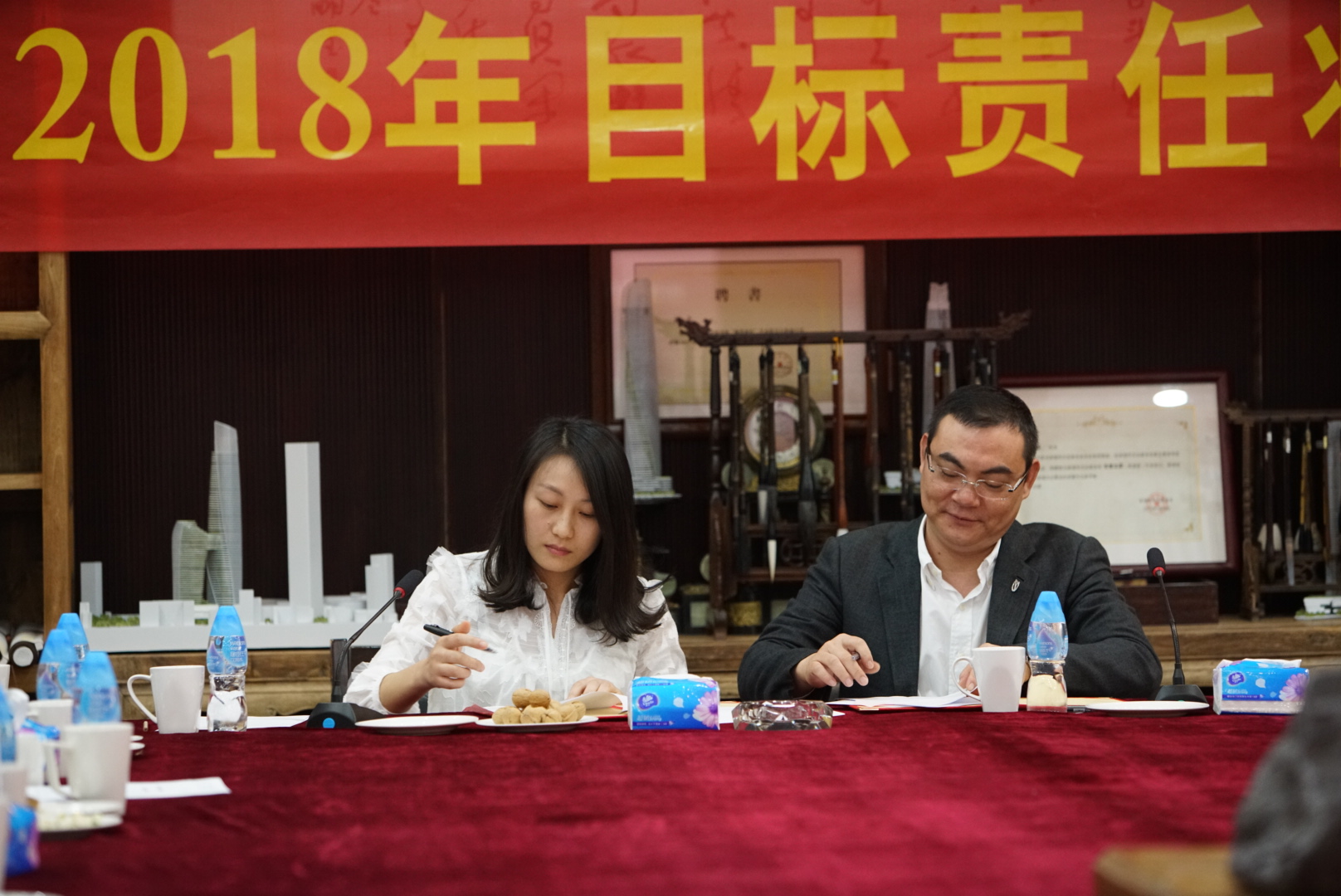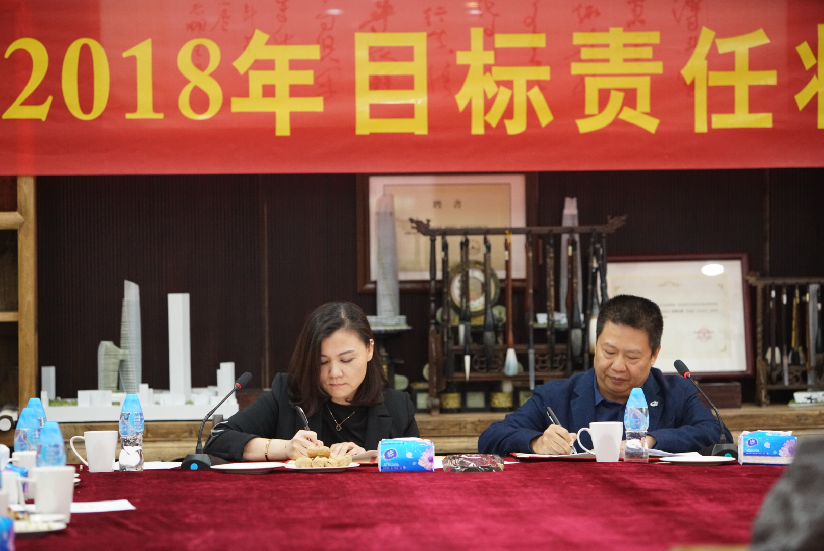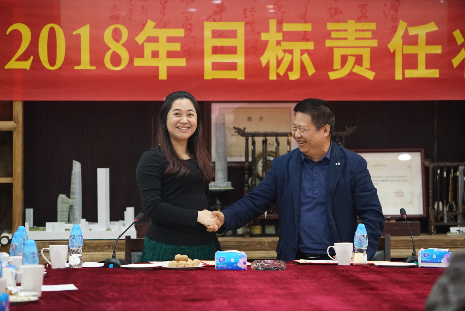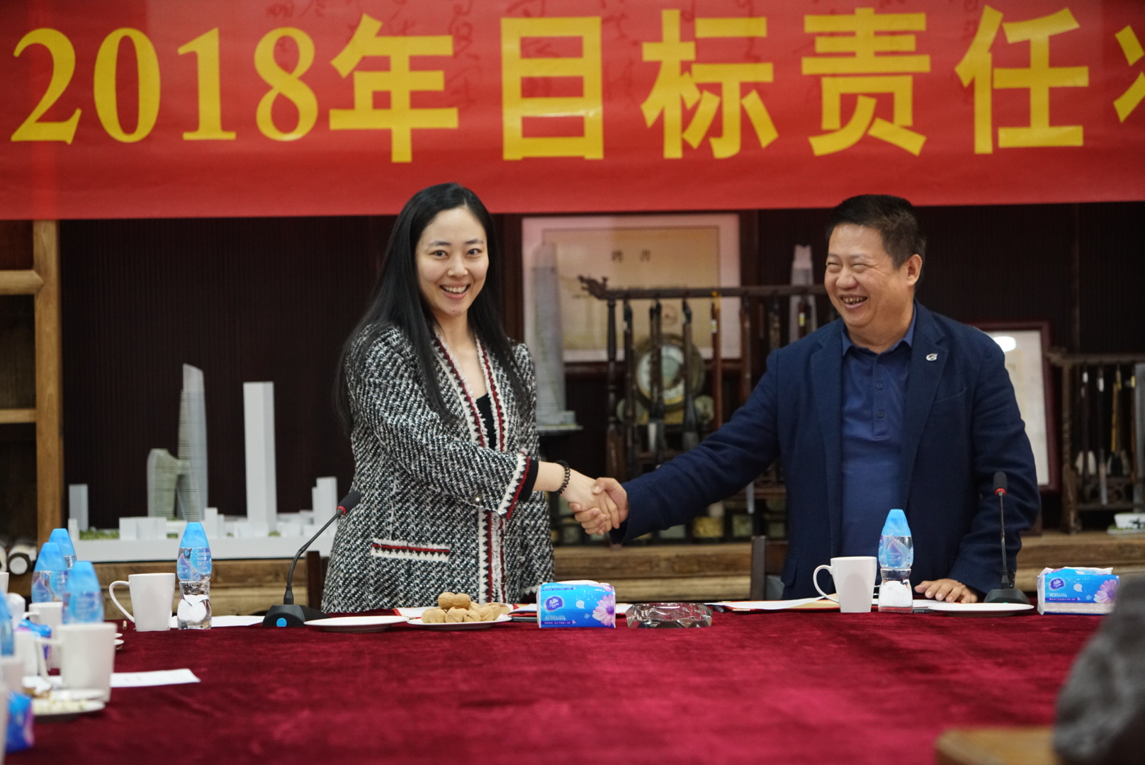 人力資源部總經(jīng)理、辦公室主任薛紅與董事總裁余道群簽署目標(biāo)責(zé)任狀