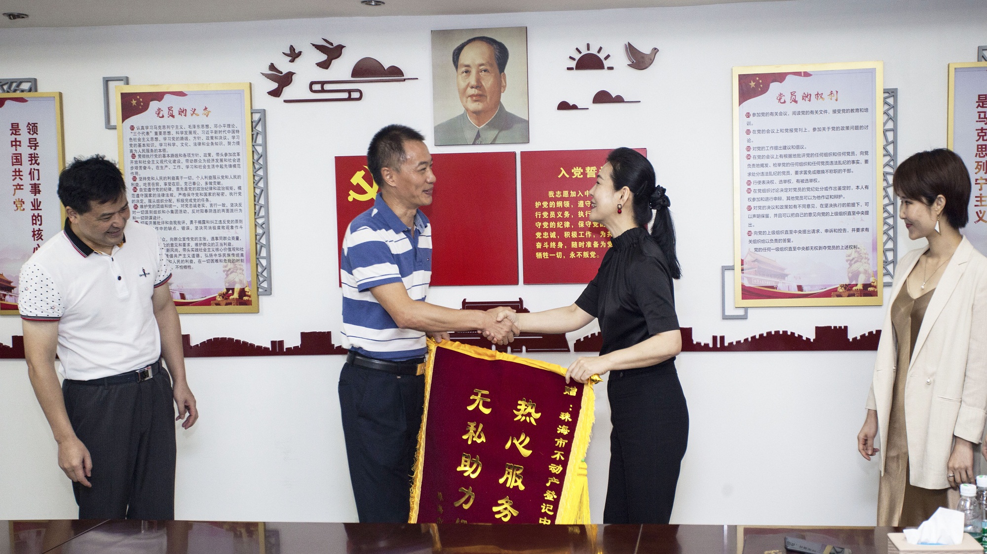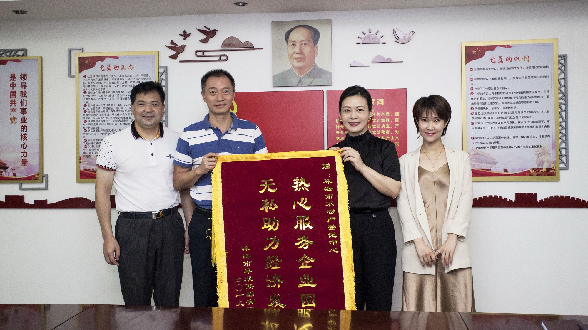 華策集團董事行政總監(jiān)程因(右二),資金計劃二部總經理陳小燕(右一)代表華策集團贈予錦旗,珠海市不動產登記中心副主任張川(左二)、曾德軍(左一)代表登記中心接收錦旗