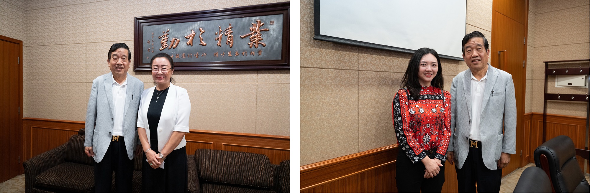 中國書法家協(xié)會主席蘇士澍與華策集團(tuán)副總裁趙日云(左圖)、華策集團(tuán)行政副總監(jiān)田婷婷(右圖)合影留念