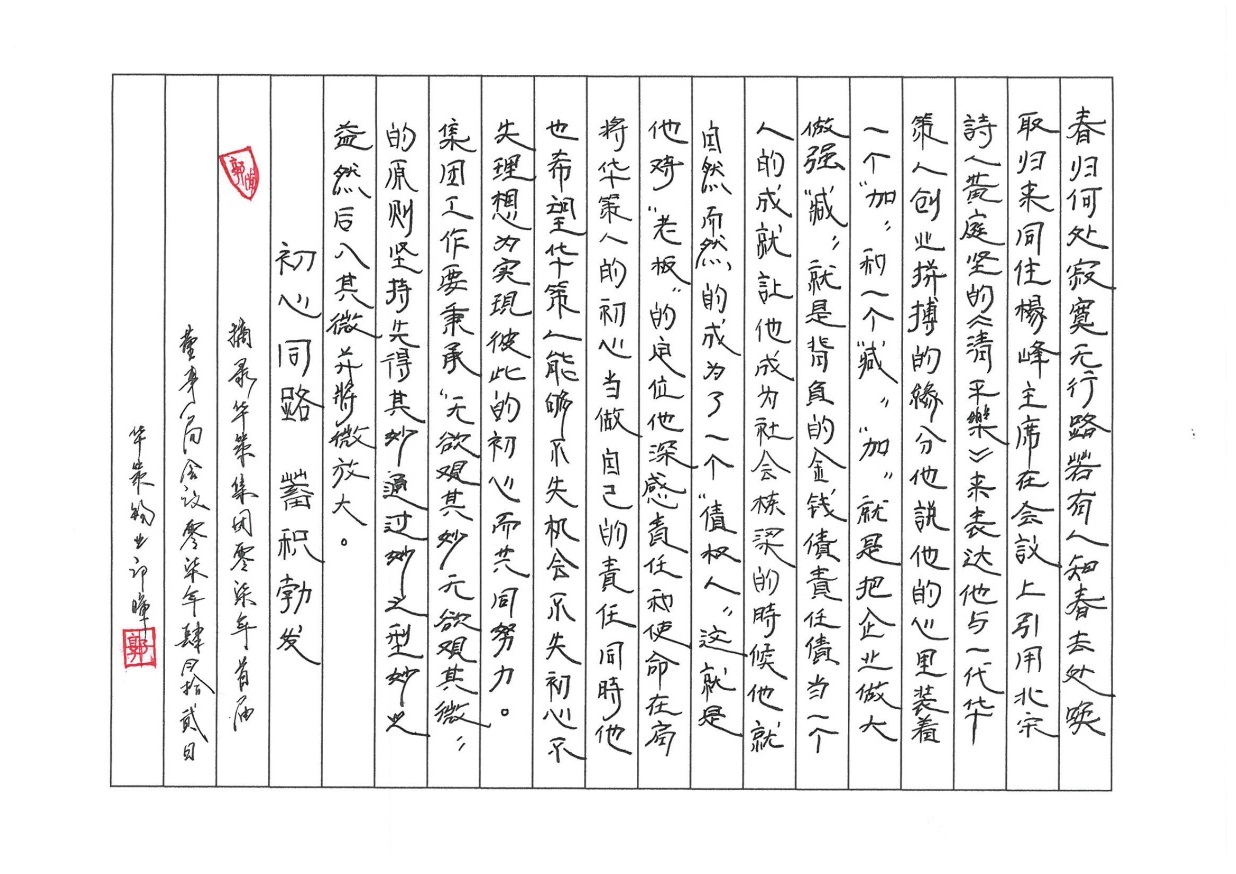 書法是中華傳統(tǒng)文化的符號(hào),正如楊峰主席所講,“愿這個(gè)遠(yuǎn)古(書法文化)在年輕一代中不再認(rèn)為‘老土’,讓一代代人寫好中國字、做好中國人”,集團(tuán)公司將繼續(xù)舉辦更多更好的文化活動(dòng),希望廣大華策人能夠在計(jì)算機(jī)應(yīng)用普遍的今天,傳承、學(xué)習(xí)書法文化,汲取悠悠華夏那璀璨的文化內(nèi)涵與精華。